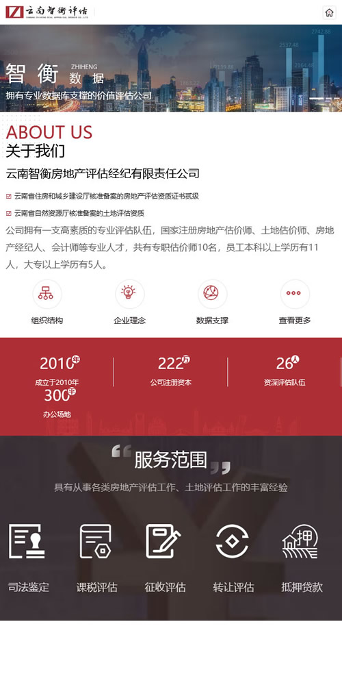 云南智衡房地产评估经纪有限责任公司具备由云南省住房和城乡建设厅核准备案的房地产评估资质证书贰级和云南省自然资源厅核准备案的土地评估资质,拥有一支高素质的专业评估队伍,国家注册房地产估价师、土地估价师、房地产经纪人、会计师等专业人才,共有专职估价师13名,员工本科及以上学历有18人。
